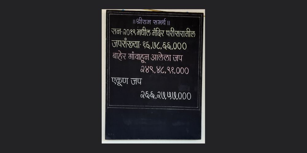 गेल्या पुण्यतिथी महोत्सवानंतर वर्षभरात मंदिर परिसरात १६ कोटी ७८ लाख ६६ हजार व बाहेरगावाहून आलेला २४९ कोटी ४८ लाख ९१ हजार असा मिळून २६६ कोटी २७ लाख ५७ हजार इतका श्रीराम नामजप आज सकाळी श्रींच्या समाधीवर अर्पण करण्यात आला, तसेच येत्या वर्षभरासाठी तेरा कोटी रामनाम जपाचा नव्याने संकल्प करण्यात आला.